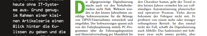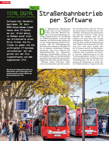 Ziel der Artikelserie ist es, den Leserinnen und Lesern des Strassenbahn Magazins gängige Softwareprodukte, deren Funktionen und Anwendungsfälle bei Verkehrsbetrieben vorzustellen. Bei dieser Vorstellung profitiert Herr Förster von seinen Projekten in der Beratung der Beschaffung von IT-Systemen.